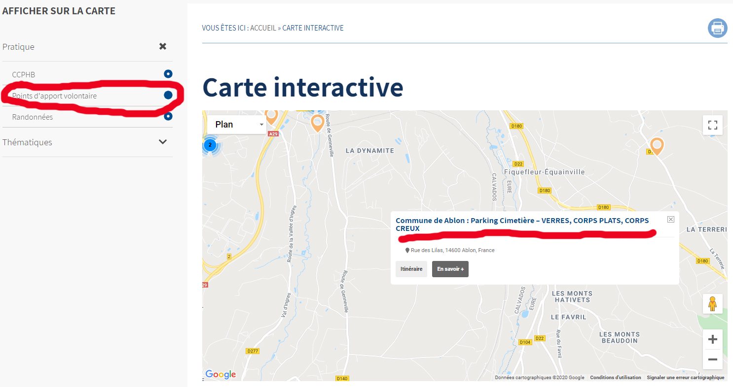 Pour utiliser la carte interactive, sélectionnez la rubrique « Points d’apport volontaire » sur le côté gauche puis zoomer non loin de votre domicile.