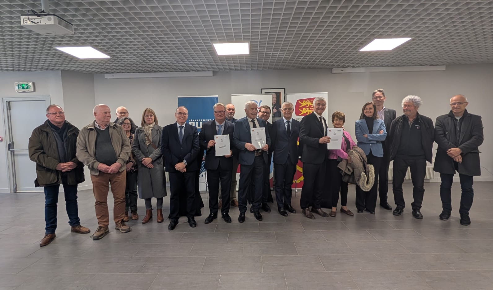 Les signataires présentant le nouveau contrat de territoire 2023-2027 (de gauche à droite : Frédéric Duché, Vice-Président du Département de l’Eure, Allain Guesdon, Vice-Président de la Communauté de communes du Pays de Honfleur Beuzeville et Hervé Morin, Président de la Région Normandie), entourés des élus du territoire.